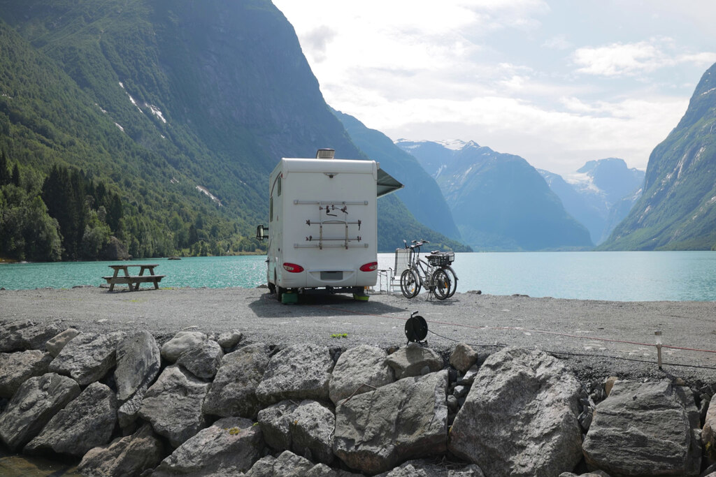 RV parked by a serene lake surrounded by mountains, showcasing the beauty of off-grid camping and sustainable RV living